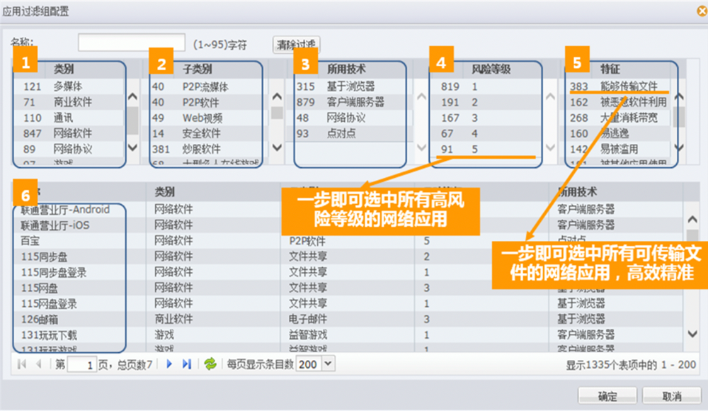●精准应用筛选。evo视讯真人官网下一代防火墙给予了精细化的应用筛选机制。用户可根据应用名称、应用类别、应用子类别、风险级别、所用技术、应用特征等6大条件。精确筛选出感兴趣的应用类型,如具备文件传输功能的通讯软件,或存在已知漏洞、基于浏览器的WEB视频应用等等,从而实现精细化的应用管控。